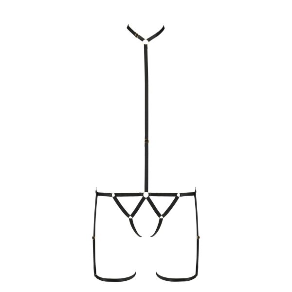 O arnês corporal Brenda da Devil Collection é uma peça de lingerie inovadora e ousada, que combina três elementos distintos: uma gargantilha sensual, tiras ajustáveis e ligas de arnês.