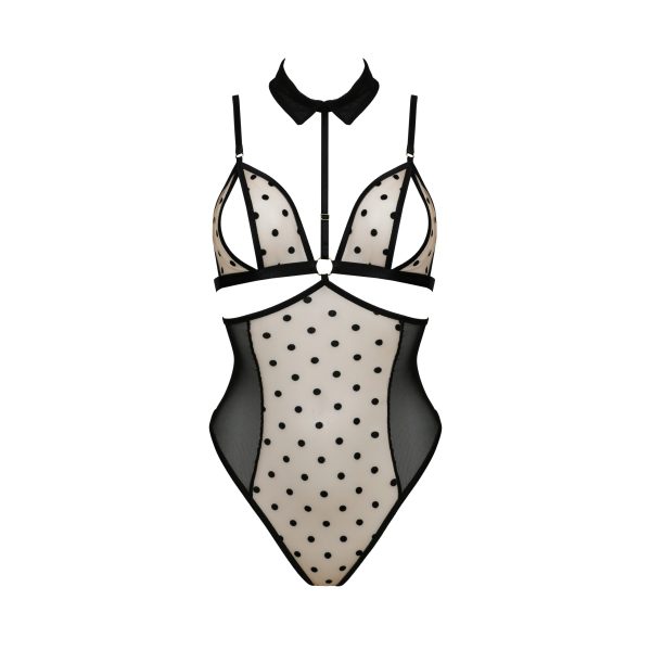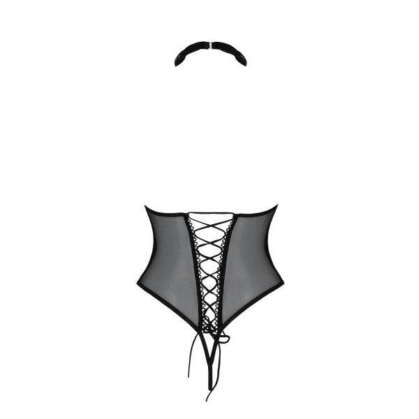 O soutien apresenta copas abertas, um detalhe arrojado que exala sensualidade, enquanto a gargantilha em forma de gola confere um toque sofisticado e irresistível.