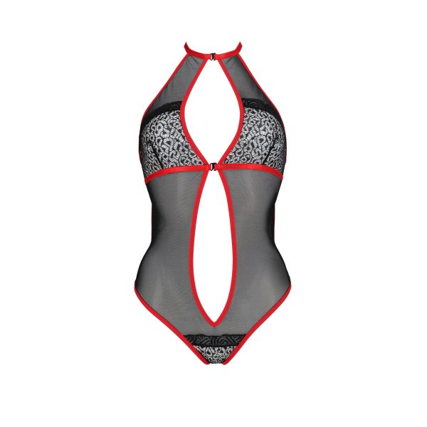 A parte frontal é adornada com delicadas aplicações de renda, que acrescentam um toque de sofisticação e feminilidade. Está disponível em duas cores, preto e vermelho, e é ideal para ocasiões especiais.