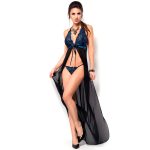 Romântica e requintada camisa de noite comprida elaborada em micro rede muito suave e semitransparente. As copas da camisa de noite e a tanga que acompanha este conjunto são adornadas por detalhes florais num tecido azul escuro brilhante alternado com renda, criando um efeito muito luxuoso. A camisa abre pela frente, fechando-se com um laço acetinado preto, e vai até aos pés. Um produto de alta qualidade da CHILIROSE, apresentado numa caixa elegante.