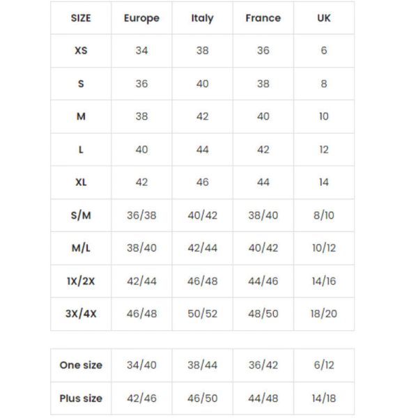 | Size | Peito (cm) | Cintura (cm) | Anca (cm) |