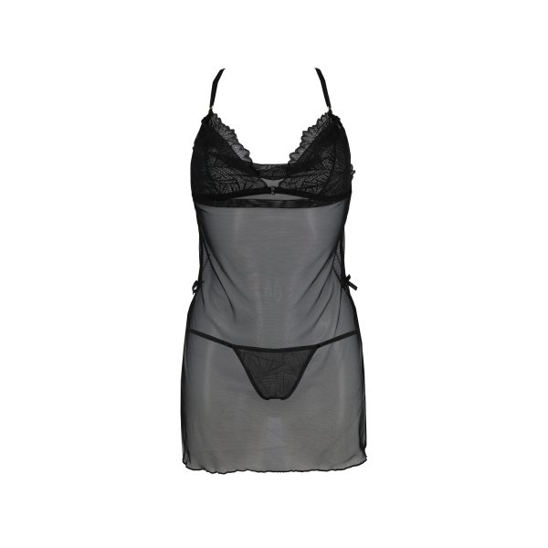 O tecido de tule preto, delicado e arejado, adiciona uma leve transparência que desperta os sentidos. Os detalhes em renda fina realçam o decote e as bainhas, criando um contraste sedutor e sofisticado.