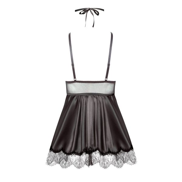 Design: A renda intrincada no busto acrescenta elegância, enquanto a saia de cetim com acabamento em renda cria um efeito sensual. As alças ajustáveis proporcionam o ajuste perfeito, realçando as suas melhores caraterísticas. A tanga é feita dos mesmos materiais para garantir o visual perfeito. A máscara de renda a condizer completa o conjunto, dando um toque de mistério e sensualidade.