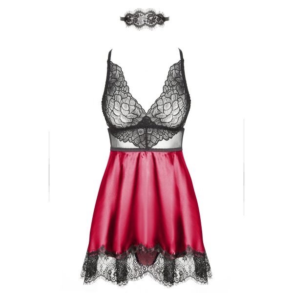 O conjunto inclui: Uma camisa de noite, uma tanga e uma máscara de renda a condizer.