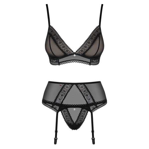 – Conjunto sensual de três peças com adornos rendados;
