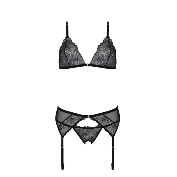 O conjunto de 3 peças Deliena é composto por três itens: um sutiã, uma tanga e um cinto de ligas. Confecionado em renda preta de elevada qualidade, destaca-se pelos detalhes em verde, que lhe conferem um toque de sofisticação. O sutiã tem alças ajustáveis, que proporcionam um ajuste perfeito e confortável.