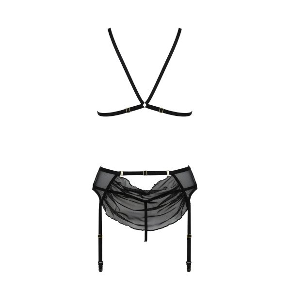 A tanga com abertura entre pernas complementa o conjunto com elegância, enquanto o cinto de ligas adiciona um charme clássico e sedutor. Os materiais utilizados, poliamida, elastano e poliéster, garantem suavidade ao toque e durabilidade.