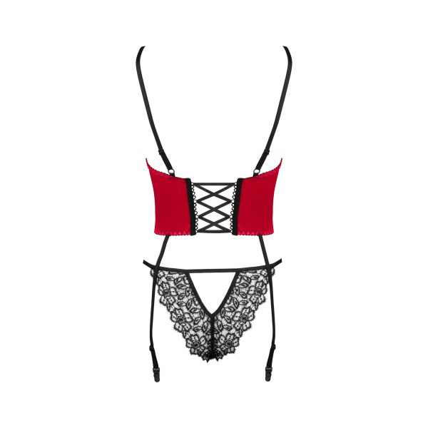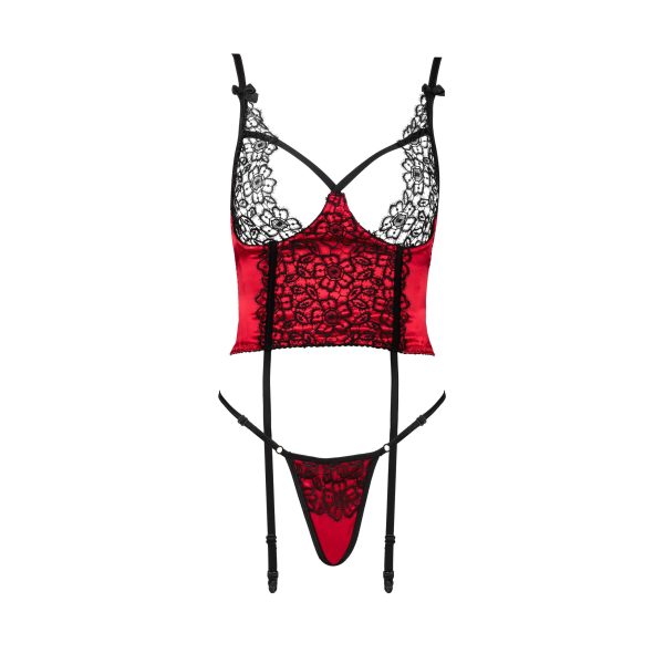 Delicie-se com o conceito de elegância e sensualidade no seu melhor com o conjunto Olena, que inclui um corpete curto e tanga feitos de cetim vermelho luxuoso e renda preta. Concebido para acender a paixão e realçar as suas curvas femininas, este conjunto é a escolha perfeita.