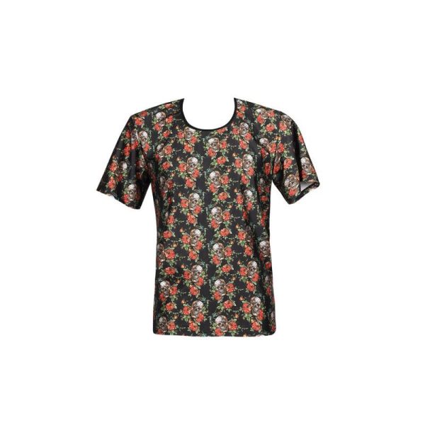 T-shirt POWER tamanho L, de textura suave e de cor clara com estampa de rosas e caveiras.